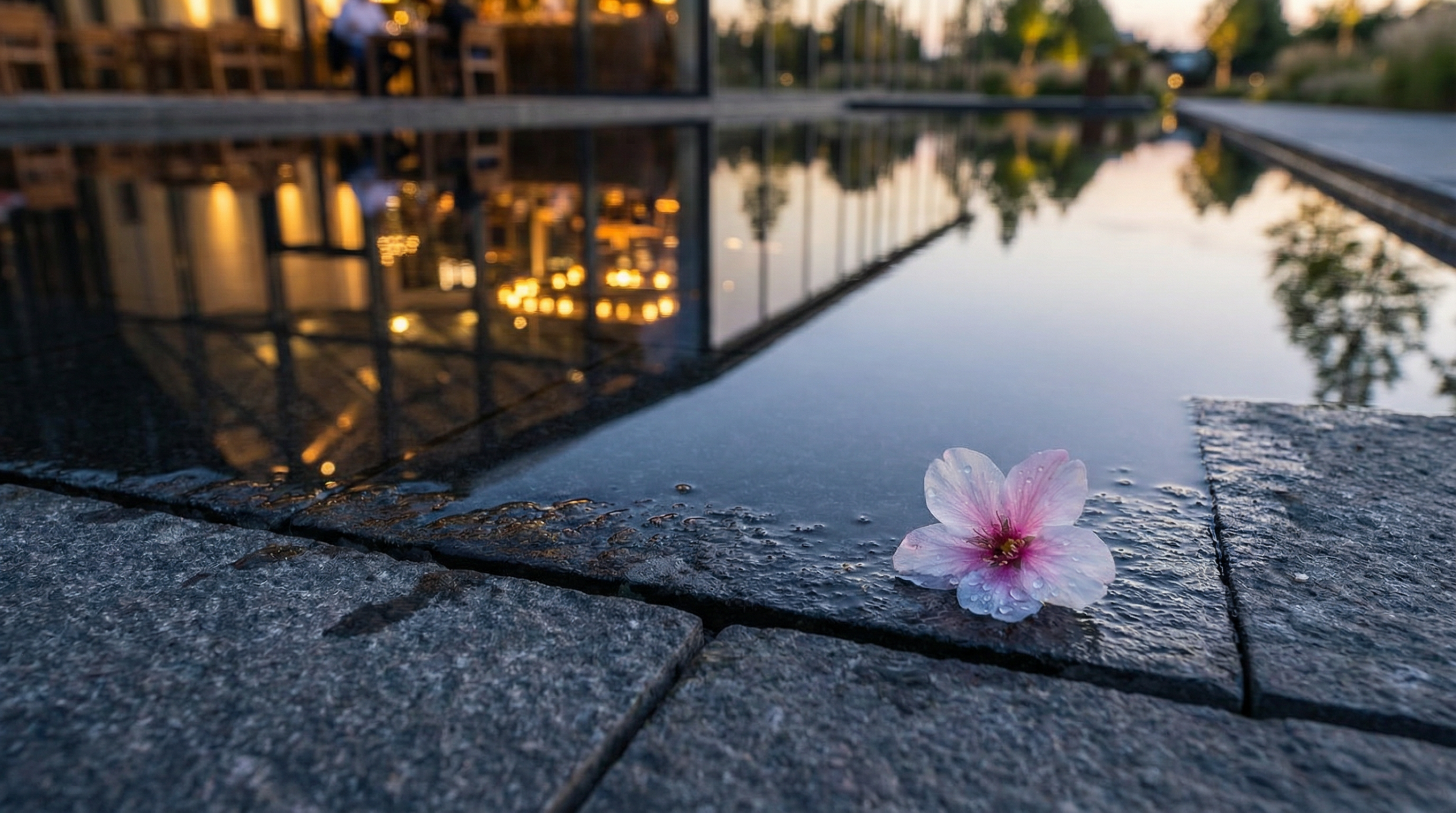 The camera moves through a landscape designed for lingering: water cascades down obsidian walls, hydrangeas release their scent at dusk, a miscanthus meadow catches the golden hour like spun glass. A woman passes through, her hand trailing the grass, releasing seeds that float upward like stars. A couple walks toward the fire pit, hands clasped, then releasing—a quiet trust that they will meet