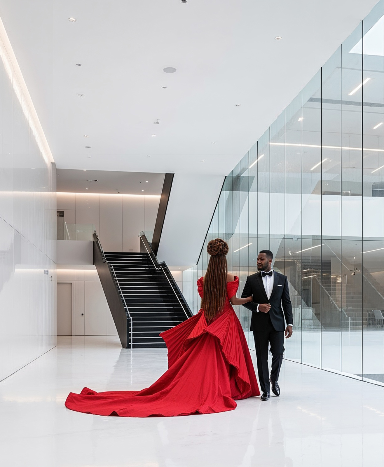 As the structure settles, the focus shifts to the couple at its heart. The camera draws in, a gentle zoom that finds them in a moment of quiet reconnection. She turns to look at her husband, her expression one of pure admiration. They are a vision of modern elegance, poised at the beginning of an evening.