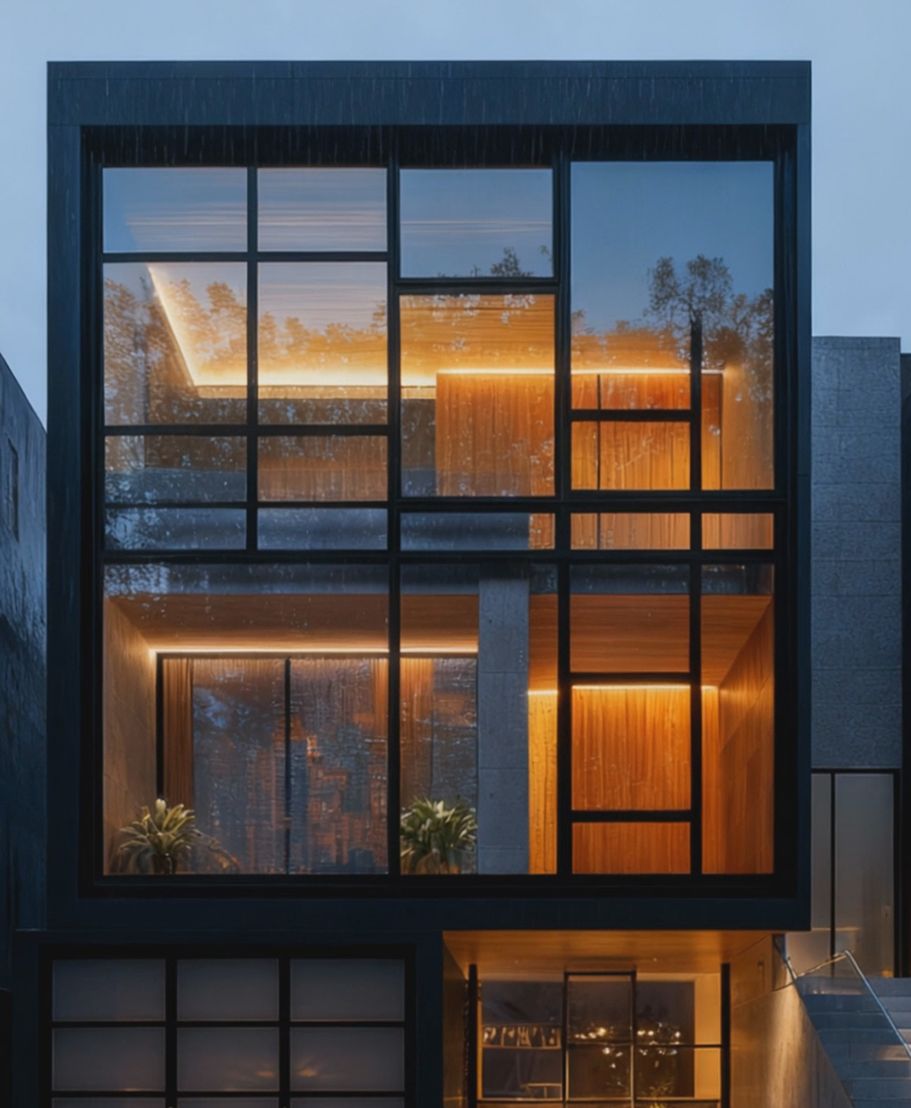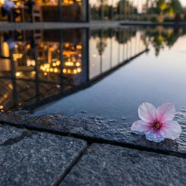 Then, time finds its proper direction. With a visible plume of breath in the suddenly chilly air, she pushes off from the wall. A camera dolly tracks backward, matching her ten unwavering strides directly toward us. She is a study in focused contrast: the sharp, luminous line of her white trousers against the ink-blot pavement, the gleam of rain in her hair, the purposeful weight of the camera in her hand. The rain isn’t a storm, but a veil of fine streaks cutting through the cones of light.