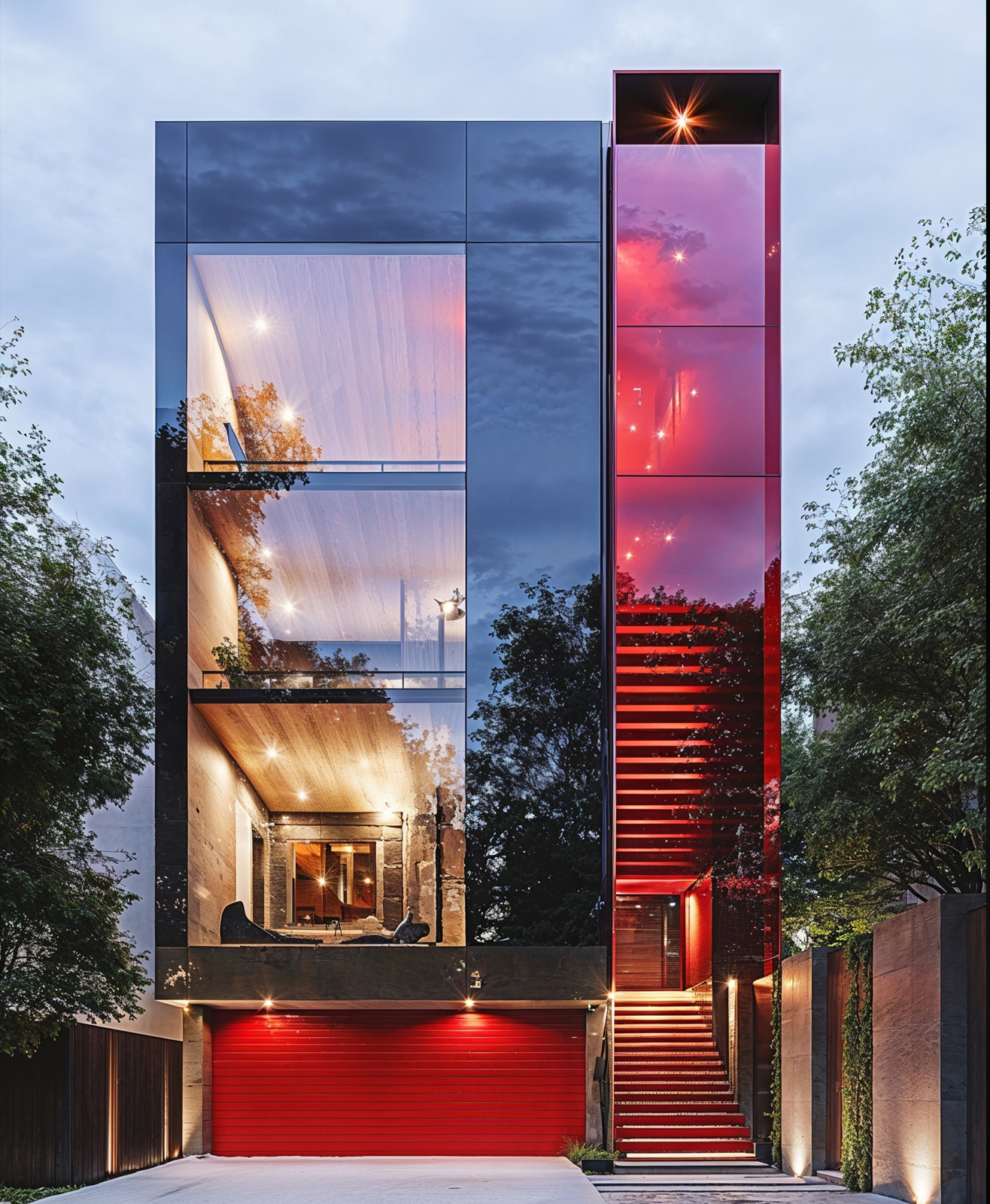 The film opens on a silent fall night. A steady, cinematic dolly pushes toward a striking residence, its form defined by vertical slats of blood-red, slick with a recent rain. The glow of dramatic spotlights etches every sharp line into the misty dark. We hold on a front view, a single, perfect raindrop tracing a slow path down a pane of reflective black glass. The quiet is broken by the low, mechanical groan of the massive red garage door beginning its ascent, a sound that feels both primal and precise. As the door rises, the rain intensifies, pattering on the pavement.
